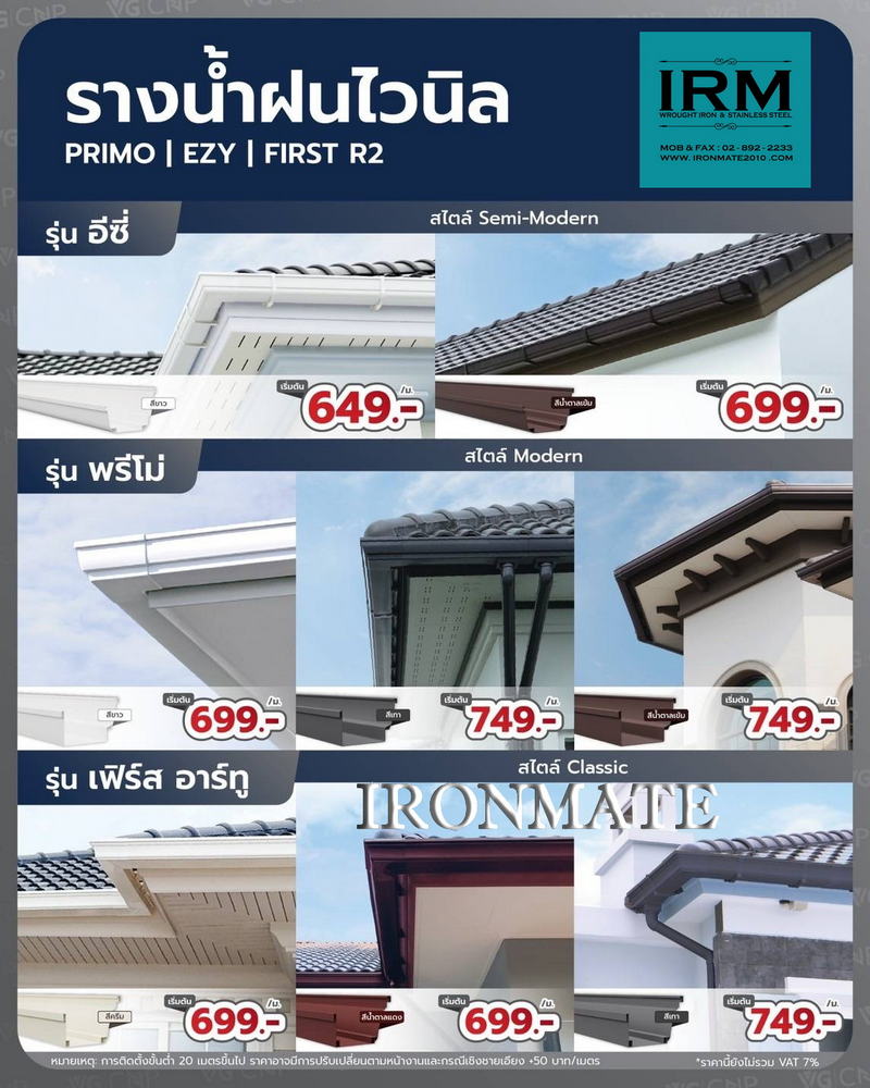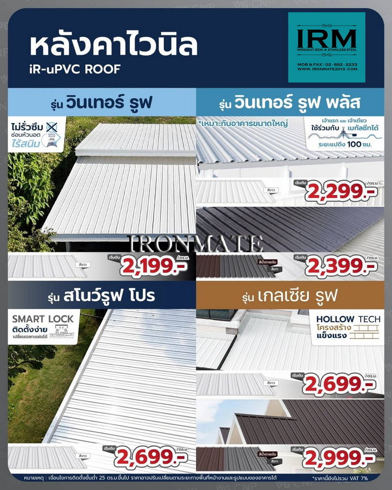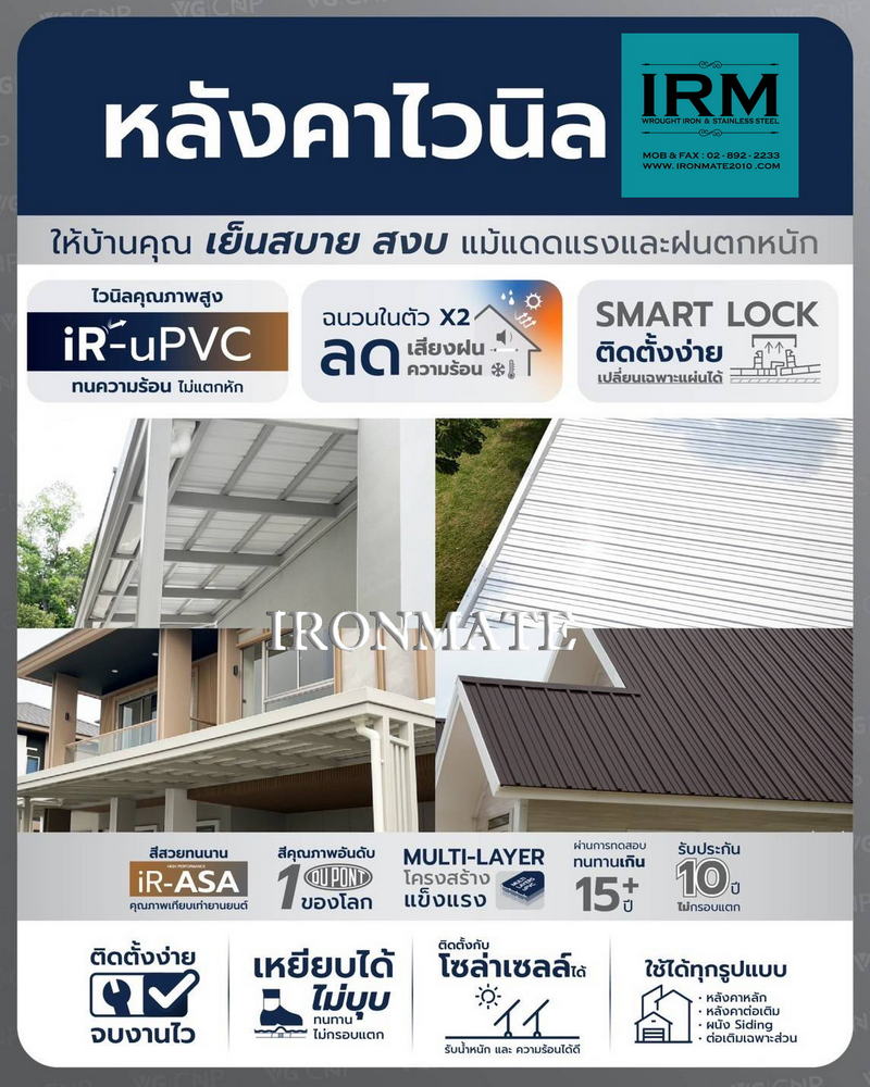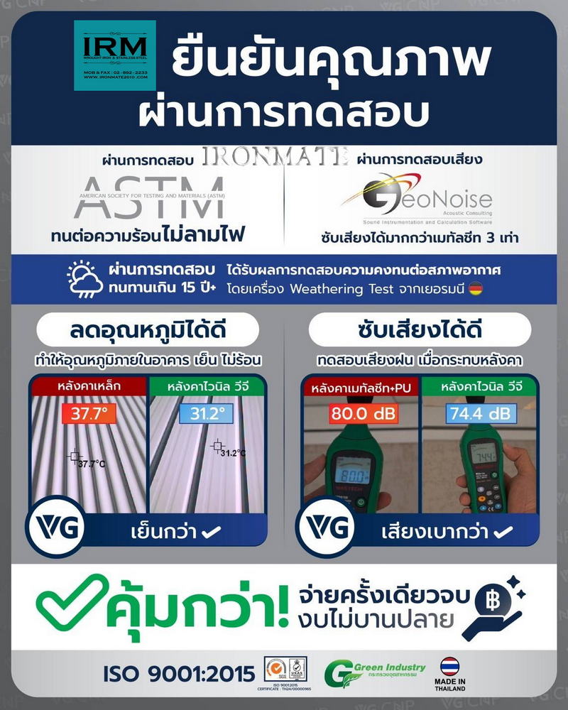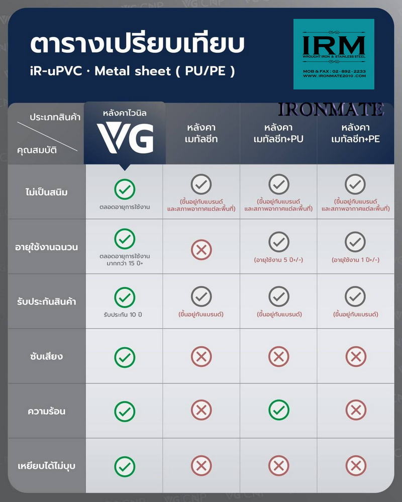 ทำไมต้องเป็นไอรอนเมท เพื่อนคู่คิดเรื่องงานติดตั้งหลังคาไวนิล รางน้ำและระแนงไวนิล เพราะทีมงานเฉพาะของวีจี ที่มีคุณภาพ ดูตั้งแต่นำเสนอราคาสินค้า รวมถึงงานติดตั้ง เพื่อความพึ่งพอใจของลูกค้า ทั้งเรื่องราคา และงานบริการ โดยเฉพาะอย่างยิ่งสินค้ามีรับประกันมาตรฐาน10ปีขึ้น จึงทำให้ลูกค้าสบายใจและสบายกระเป๋า กับทีมงานติดตั้งหลังคาไวนิล รางน้ำและระแนงไวนิล ของวีจี