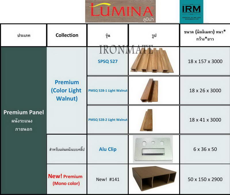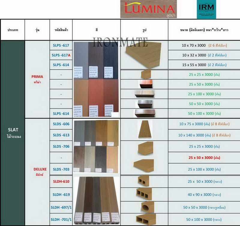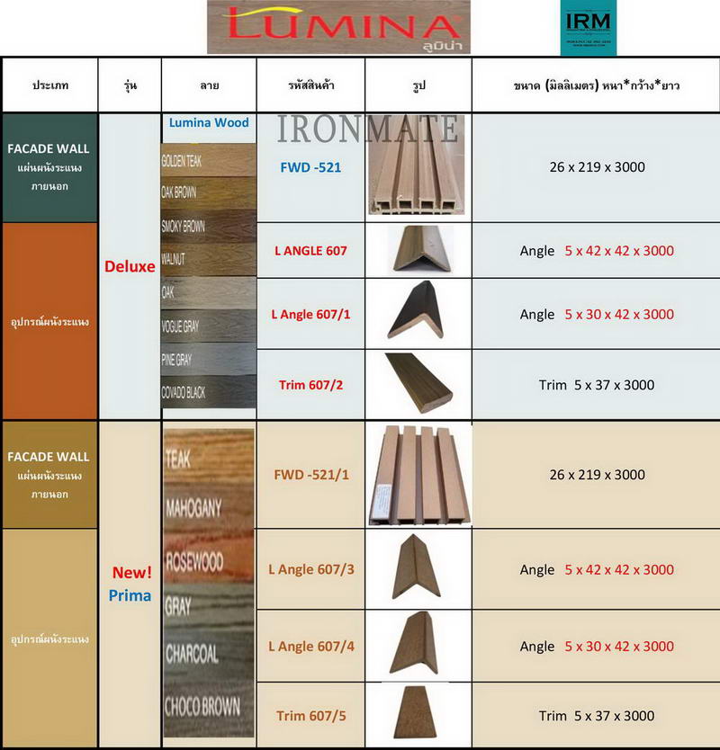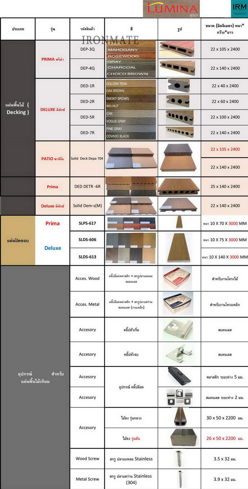 แผ่นพี้นระแนงไม้เทียมสำหรับภายนอก LUMINA WPC รุ่น PRIMA (mono) เป็นแผ่นพื้นที่ให้ความสวยงาม และผิวแผ่นพื้นไม้ผิวสัมผัสลายไม้ เหมือนไม้ธรรมชาติ แต่มีความแข็งแรง ทนทาน ไม่เปรอะหัก เนื่องจากแผ่นพี้นระแนงไม้เทียมของLumina ผลิตจากผงไม้เนื้อแข็ง ผสมกับพลาสติกโพลิเมอร์ ที่มีคุณลักษณะเด่นที่ทนทานต่อการสึกกร่อน และกันน้ำได้ดี จึงเหมาะสำหรับใช้งานภายนอกได้ดี ทนทานต่อแสงแดด เพื่อให้ได้ แผ่นพี้นระแนงไม้เทียม เกรดคุณภาพ และมีหลากสีให้เลือกตามความต้องการเพื่อสร้างสรรงานด้านดีไซน์แบไร้ขีดจำกัด
